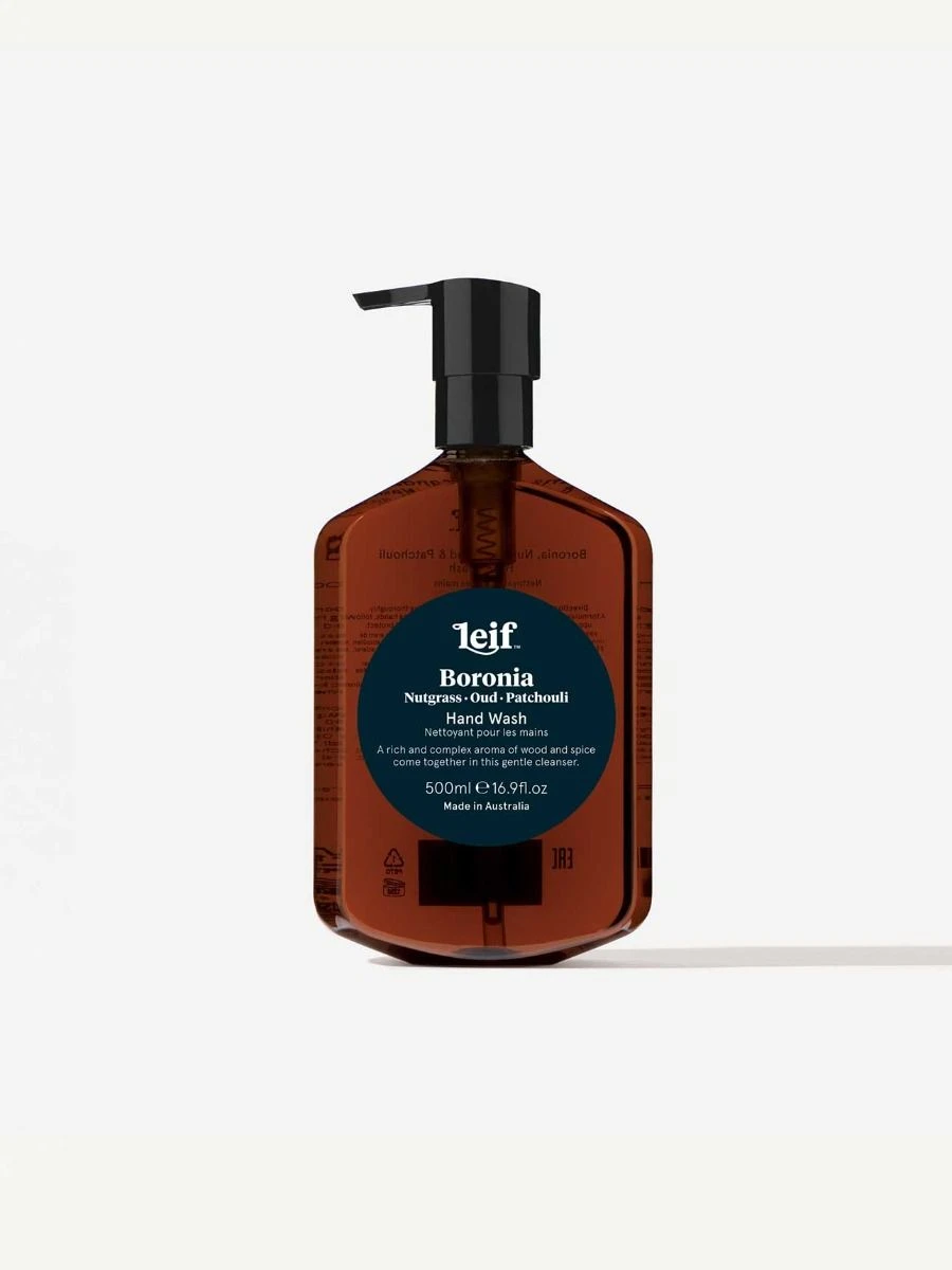 Boronia Hand Wash: Aqua (Purified Water), Cocamidopropyl Betaine, Decyl Glucoside, Polysorbate 20, PEG-150 Pentaerythrityl Tetrastearate, Parfum [(Fragrance) , Boronia Megastigma (Boronia Absolute) Flower Extract, Pogostemon Cablin (Patchouli) Leaf Oil, Amyris Balsamifera (Amyris) Bark Oil, Dipterocarpus Turbinatus (Gurjun) Balsam Oil, Cyperus Scariosus (Nagarmotha) Root Oil, Citrus Aurantium Bergamia (Bergamot) Peel Oil, Lavandula Intermedia (Lavandin) Leaf Oil, Aquilaria Crassna (Oud) Stem Oil], Benzyl Alcohol, Phenoxyethanol, Caramel, Aloe Barbadensis (Aloe Vera) Leaf Extract, Citric Acid, Sodium Hydroxide, Citronellol*, Linalool*, *Component of essential oil