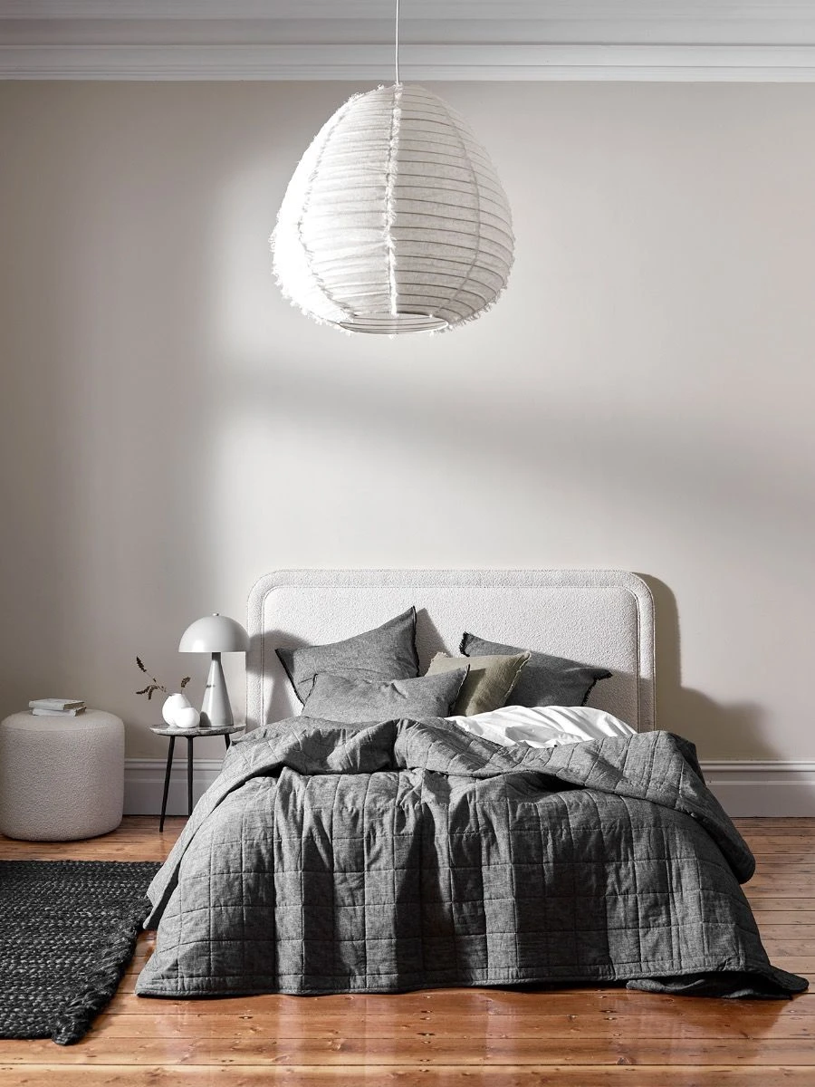 Our luxurious linen cotton Chambray Coverlet in Smoke has been woven in stunning natural shades and pre washed to achieve its tactile, natural softness. Designed for contemporary living and featuring a classic square pattern stitched over a 300gsm cotton fill. Perfect for easy layering, adding warmth and style to your bed. As the nights become warmer, a pure cotton filled Coverlet is the perfect alternative to a quilt cover.