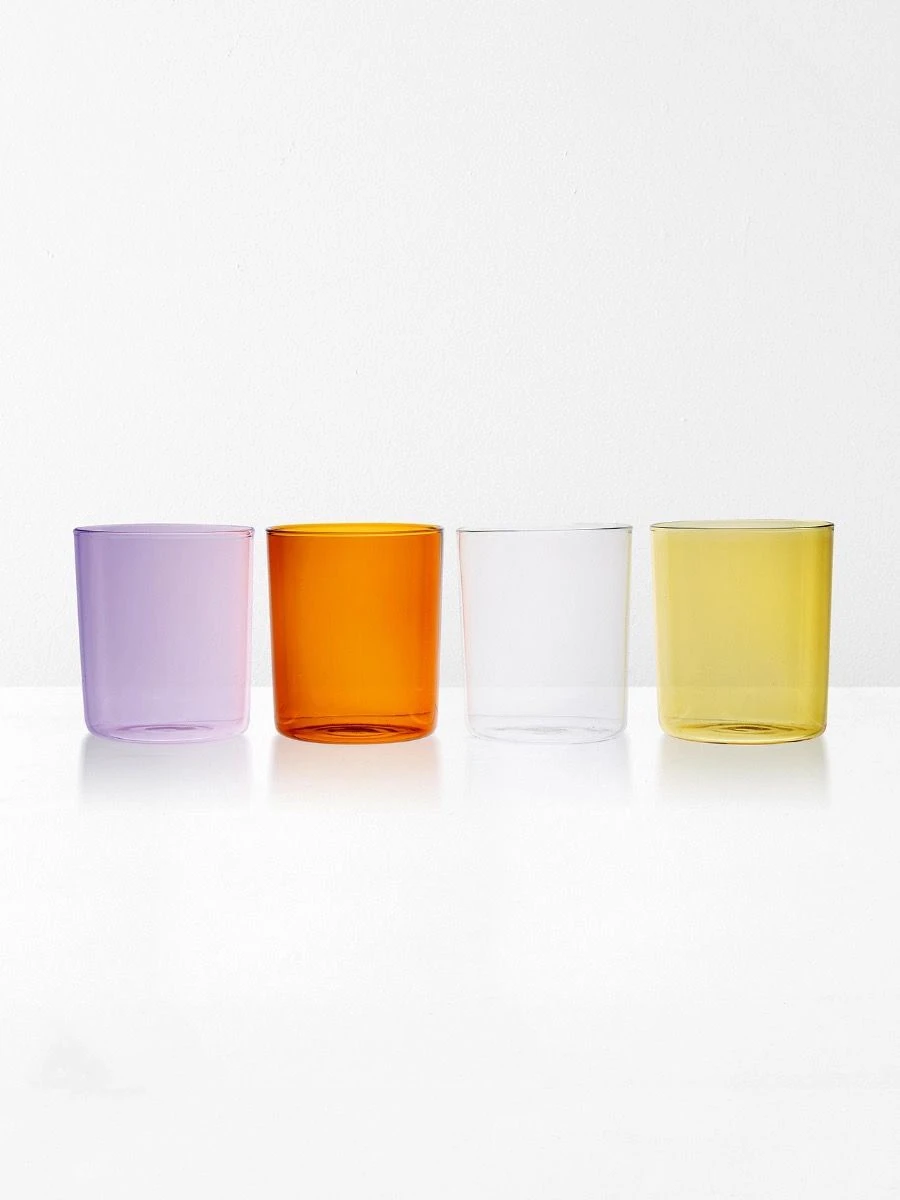 The summer set is a chromatic cocktail made of amber, pink, clear and miel gobelets. These four drinking tumblers are each individually mouth blown in coloured borosilicate glass. Each cup is heat resistant and dishwasher safe*. They are available in a range of colours and add extraordinary pleasure to the simple act of drinking water.