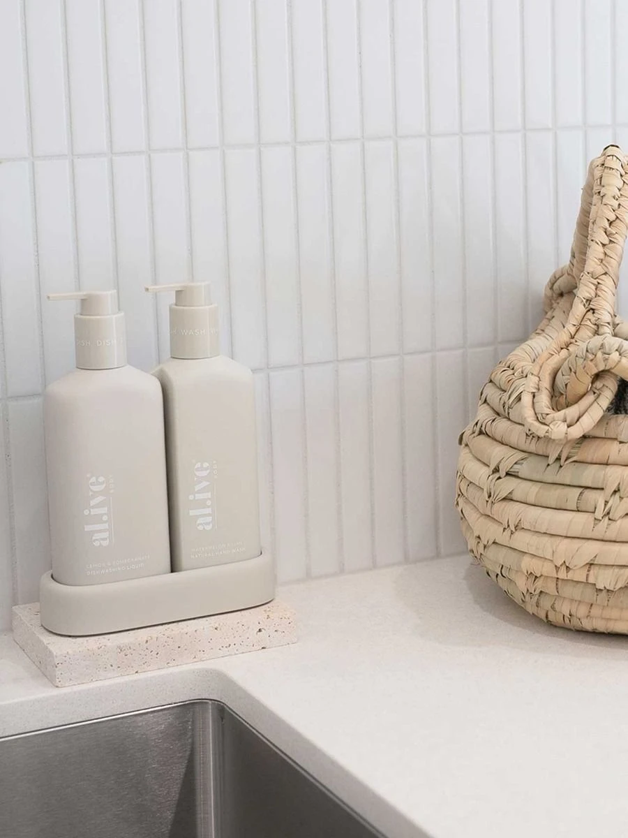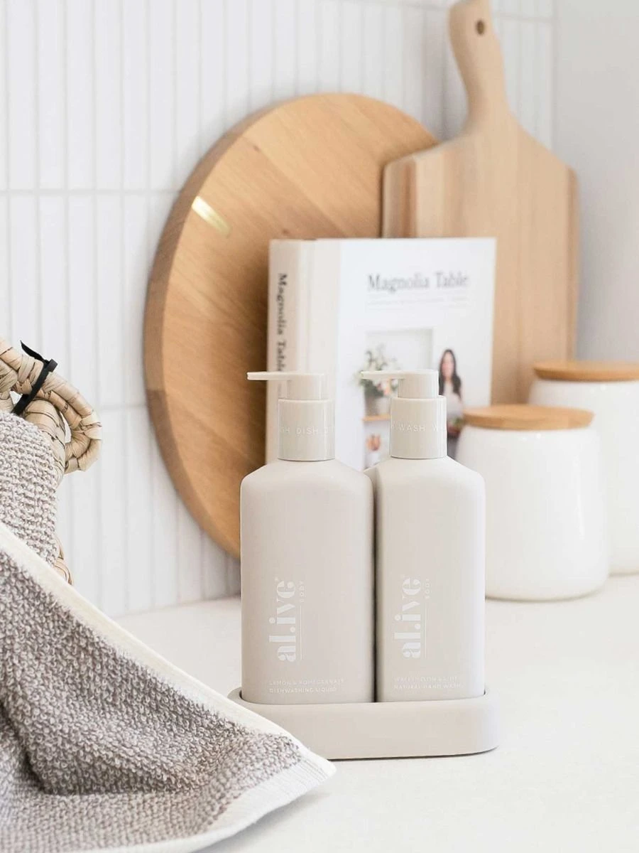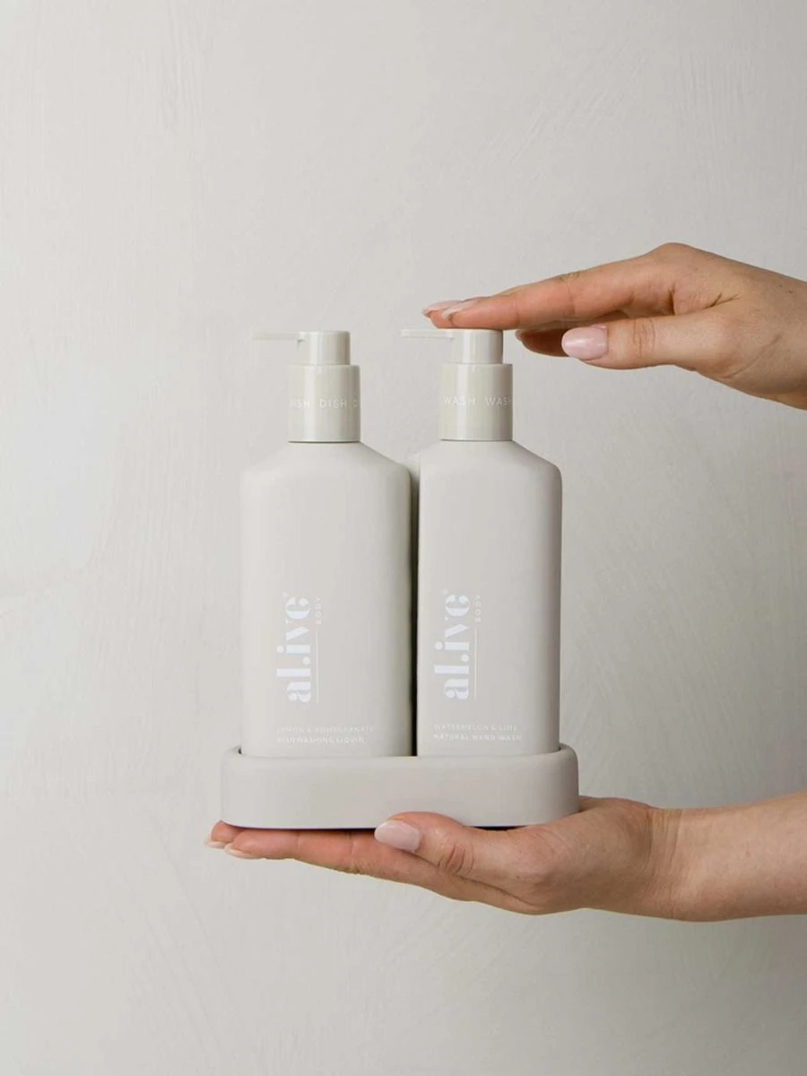The al.ive body Hand Wash & Dishwashing Liquid Premium Kitchen Duo is a beautiful yet practical product, elegantly packaged to elevate your countertop. This Duo includes a 300ml Lemon & Pomegranate Dishwashing Liquid, a 300ml Watermelon & Lime Hand Wash and a matching custom tray.