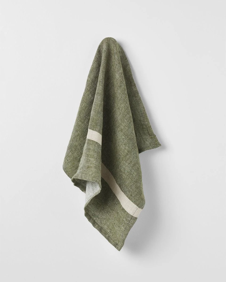 Our Herringbone Tea Towel in Khaki feature timeless modern stripes and have been woven in pure linen using natural, hand-woven linen fibres. Vintage washed for an authentic heritage look and feel, Heirloom celebrates contemporary country and city living. As well as being rich in character and texture, linen is also an eco-friendly and bio-degradable fibre that does not require irrigation to grow. Our linen is a hand made product, from dying, drying naturally in the sun, to finally being hand loomed by local artisans in one local community. All of our dyes used are natural and all by-products used in dying, including water and fabric offcuts are recycled and reused.