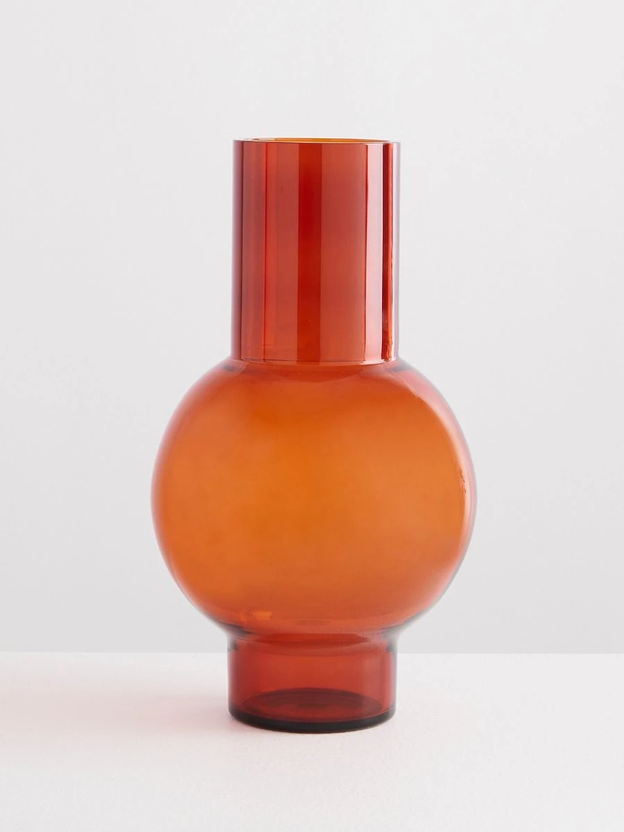 Our beacon of light, the Loulou XL vase is all grown up and dressed in a demure amber borosilicate glass. Still playful at heart, she invites you to see how many flowers can float within her buoyed bowl.
