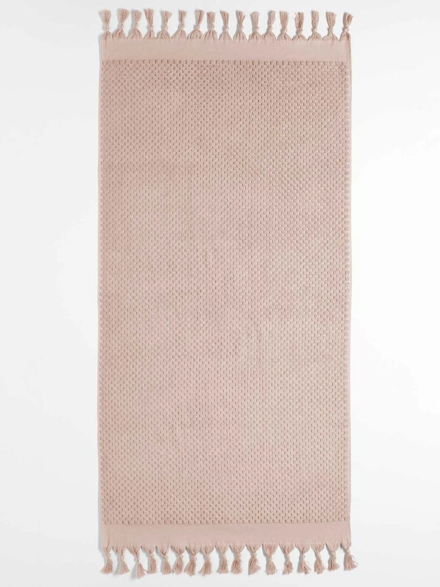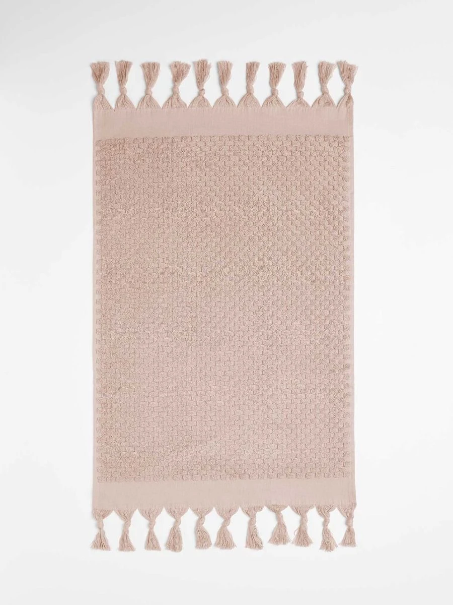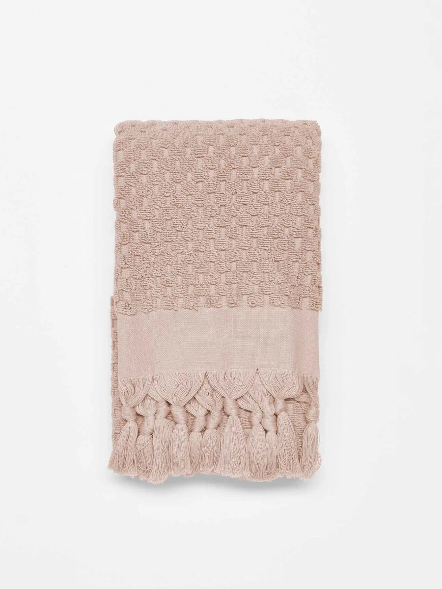 The Milos Bath & hand towels feature hand knotted fringes, and the Milos collection is woven with Sustainably Sourced Cotton.