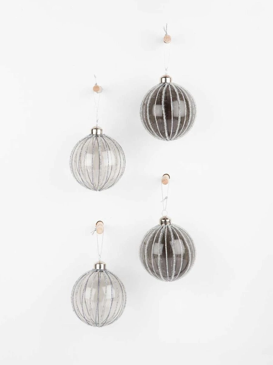 Embrace the most wonderful time of the year by adding a touch of charm to your home with the Hanging Glass Bauble Set of four smoked glass baubles with neutral-toned frosted lines.