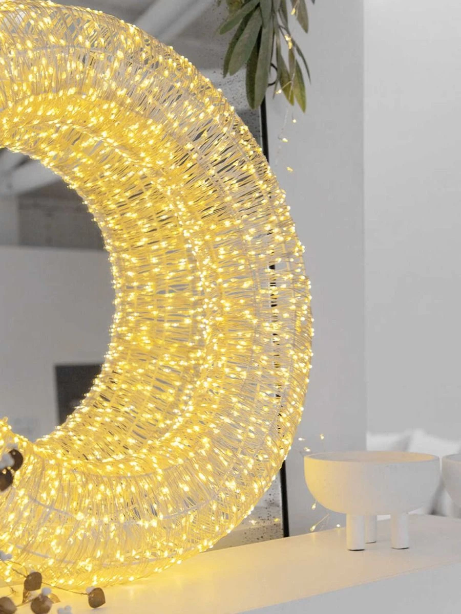 Create a warm atmosphere with glow of Capella. This metal wreath is delicately strung together with wire and is embedded with twinkling LED lights throughout.