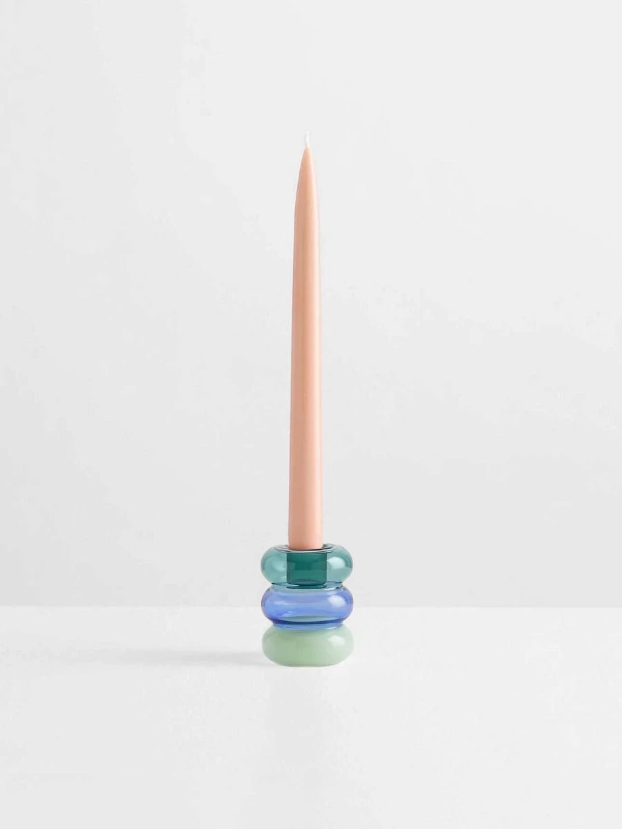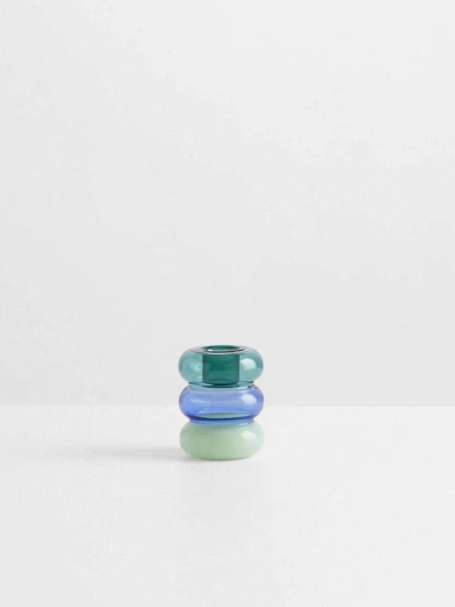 Petite Pauline is a playful stack of teal, azure and mint glass bubbles. All it needs it a candle to complete its airy silhouette! This candle holder doubles as a lucky charm, so we recommend making a wish before you light the candle that will sit on top!