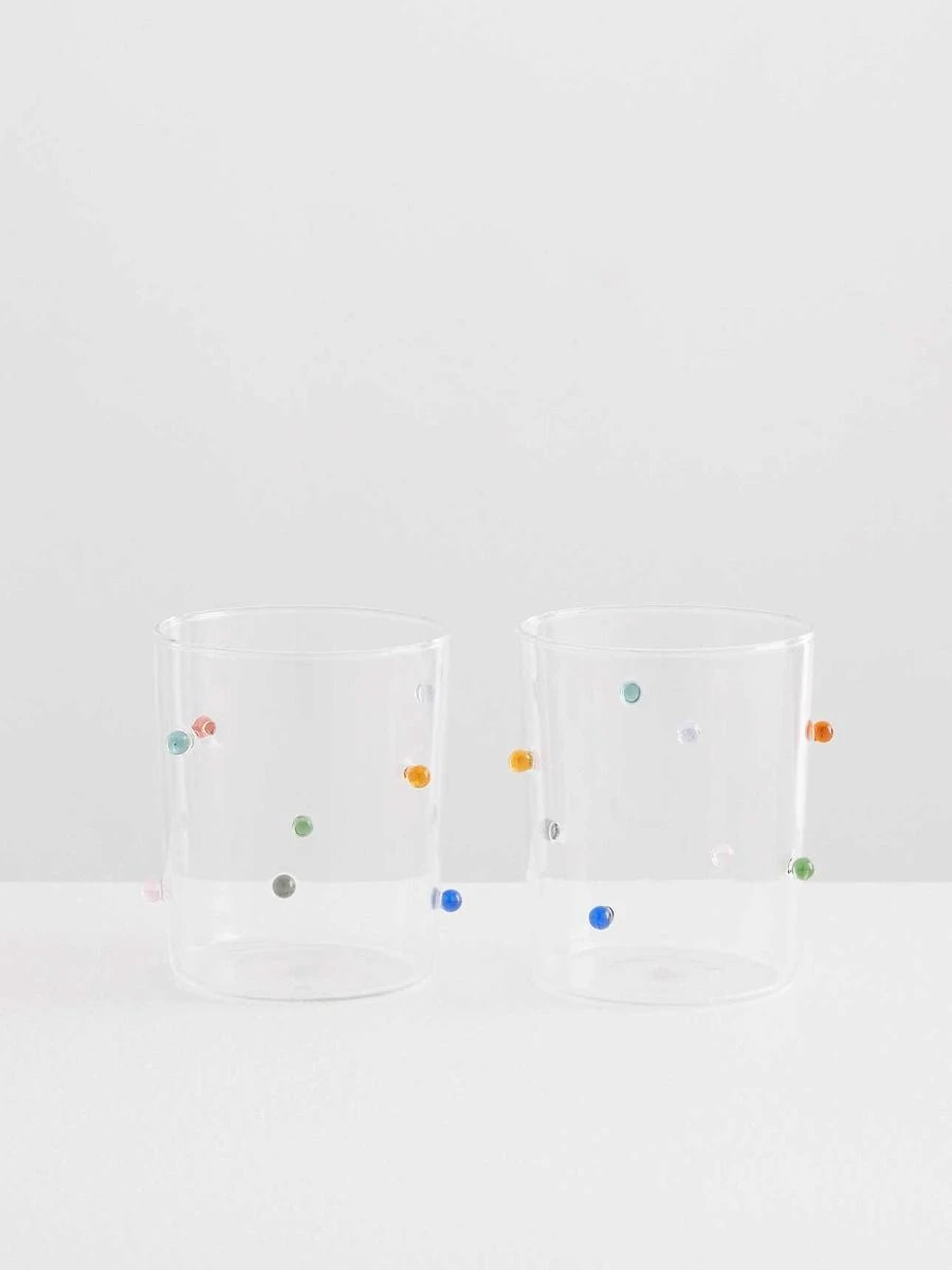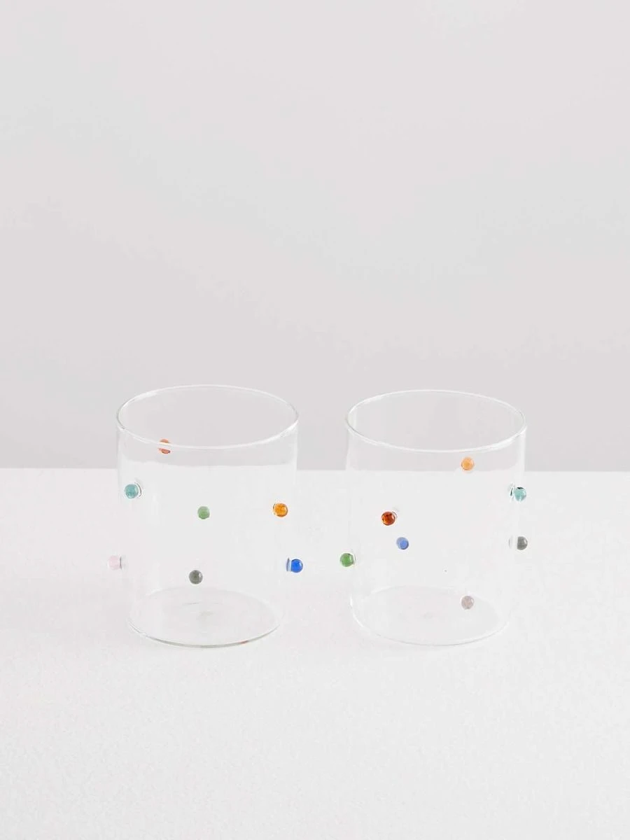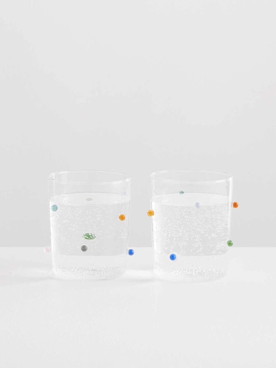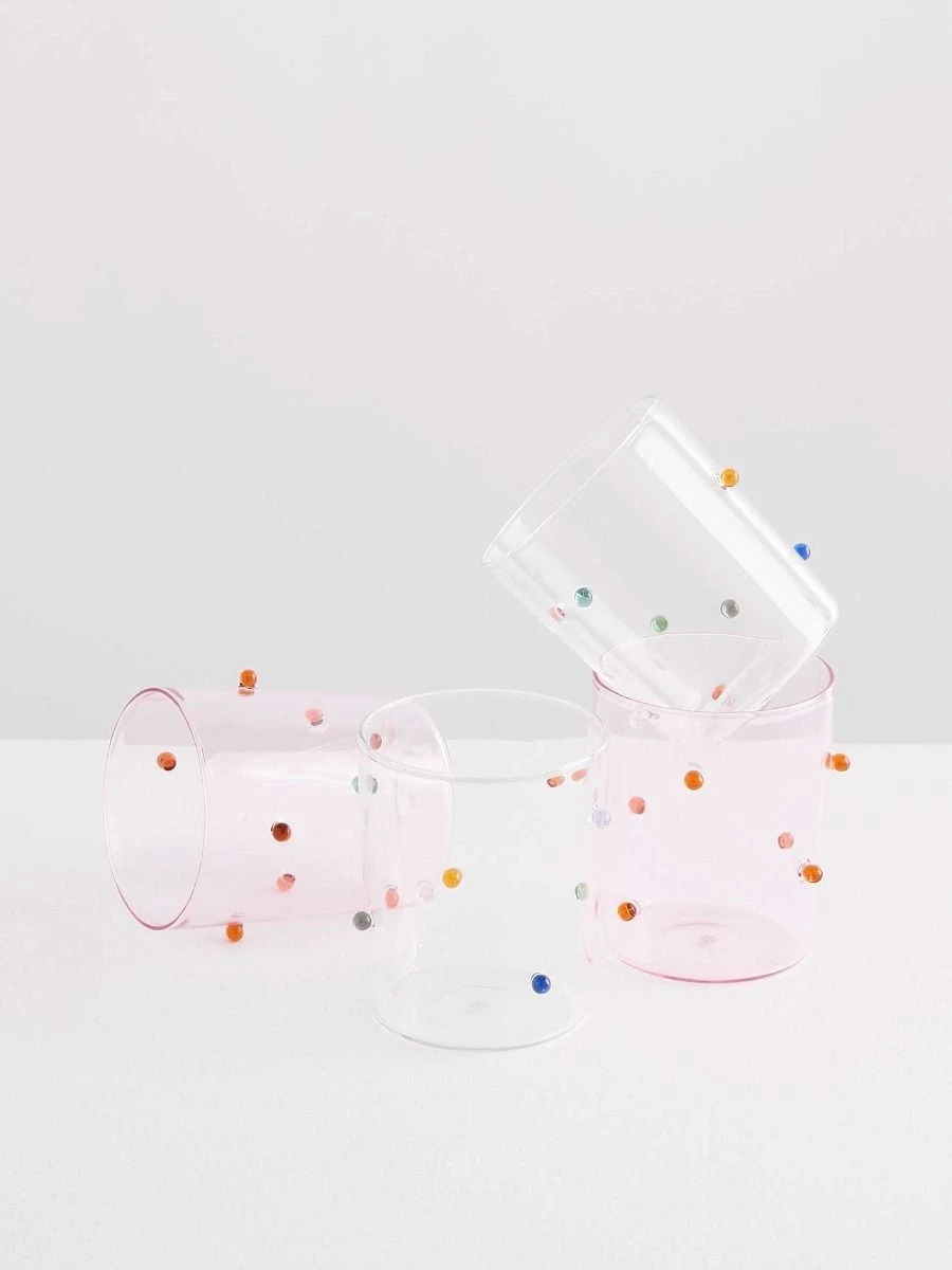 These two drinking tumblers are each handcrafted in clear borosilicate glass and adorned with floating colourful ball. Each colourful pomponette playfully mimicks the effervescent dance of our favourite fizzy drinks as the bubbles leap to and fro. No matter what you sip, these glasses are sure to add some fun to your sipping experience!