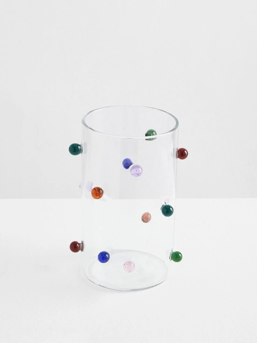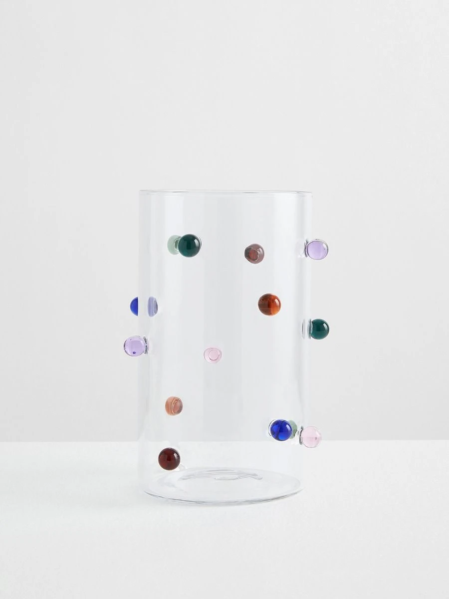 The Pomponette vase has been reimagined in the clearest borosilicate glass and draped it in a cloak of jewel toned bubbles. Delicately hand made to proudly stand as a centrepiece of any tabletop, we encourage you to fill this vase with your favourite bouquet and imagine a world amongst a kelp forest.