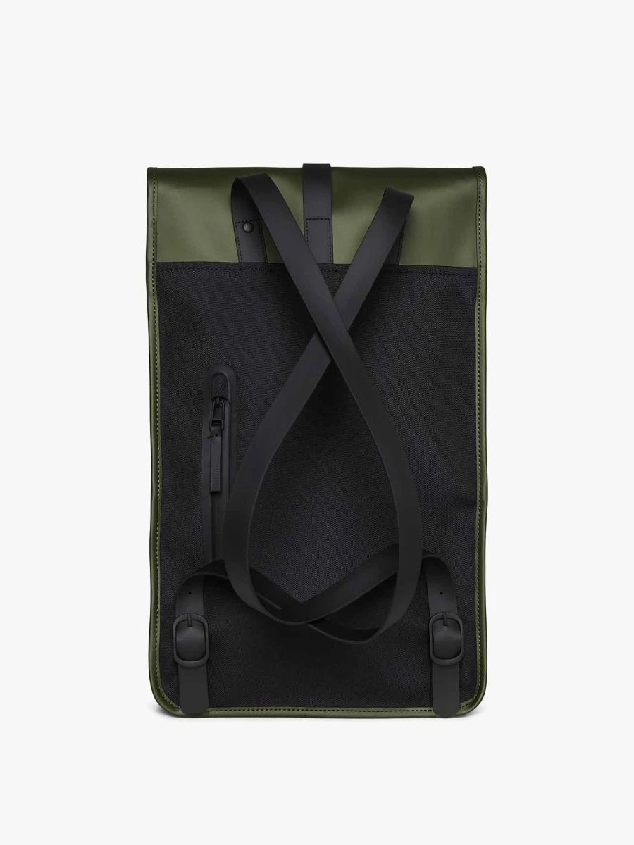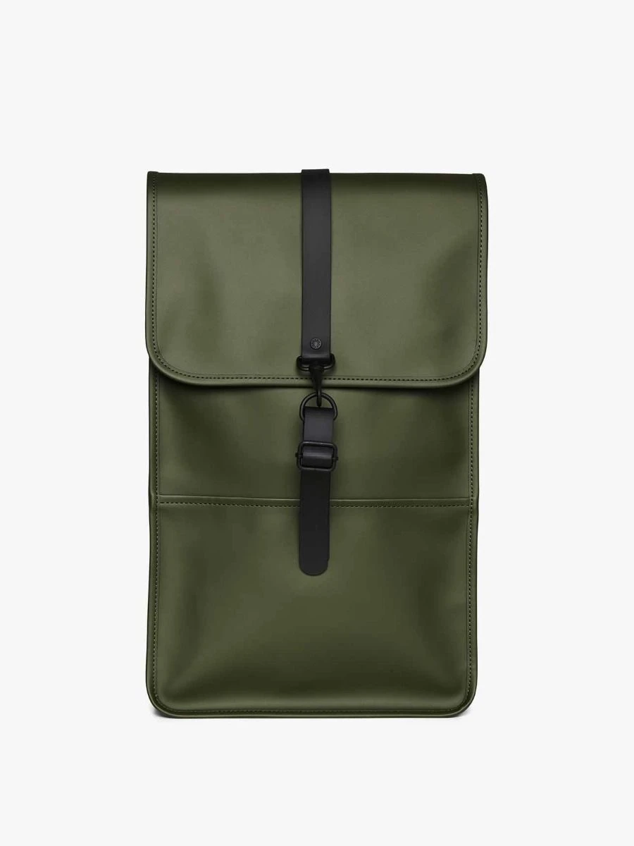 Backpack Mini is a downscaled version of Backpack, a true Rains classic. The silhouette is characterized by its prominent flap and central strap with carabiner closure. This clean and ever contemporary waterproof rucksack features an internal laptop pocket, a main compartment, and a concealed external phone pocket on the back panel.