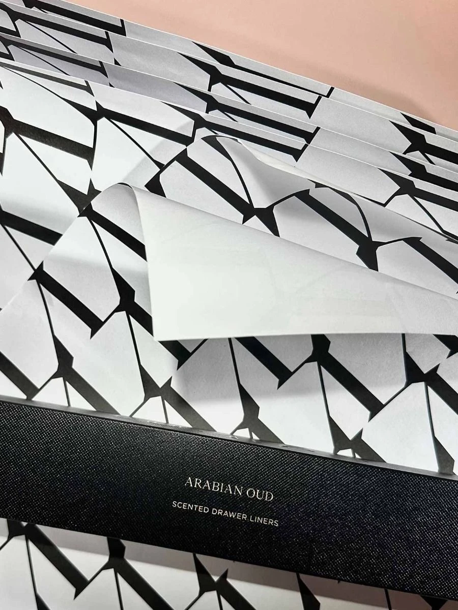 Freshen and lightly scent the contents of your wardrobe or desk drawers with these exclusive printed, luxury drawer liners. Each set contains six printed drawer liners, scented with our signature Arabian Oud fragrance and beautifully presented in a gift box.